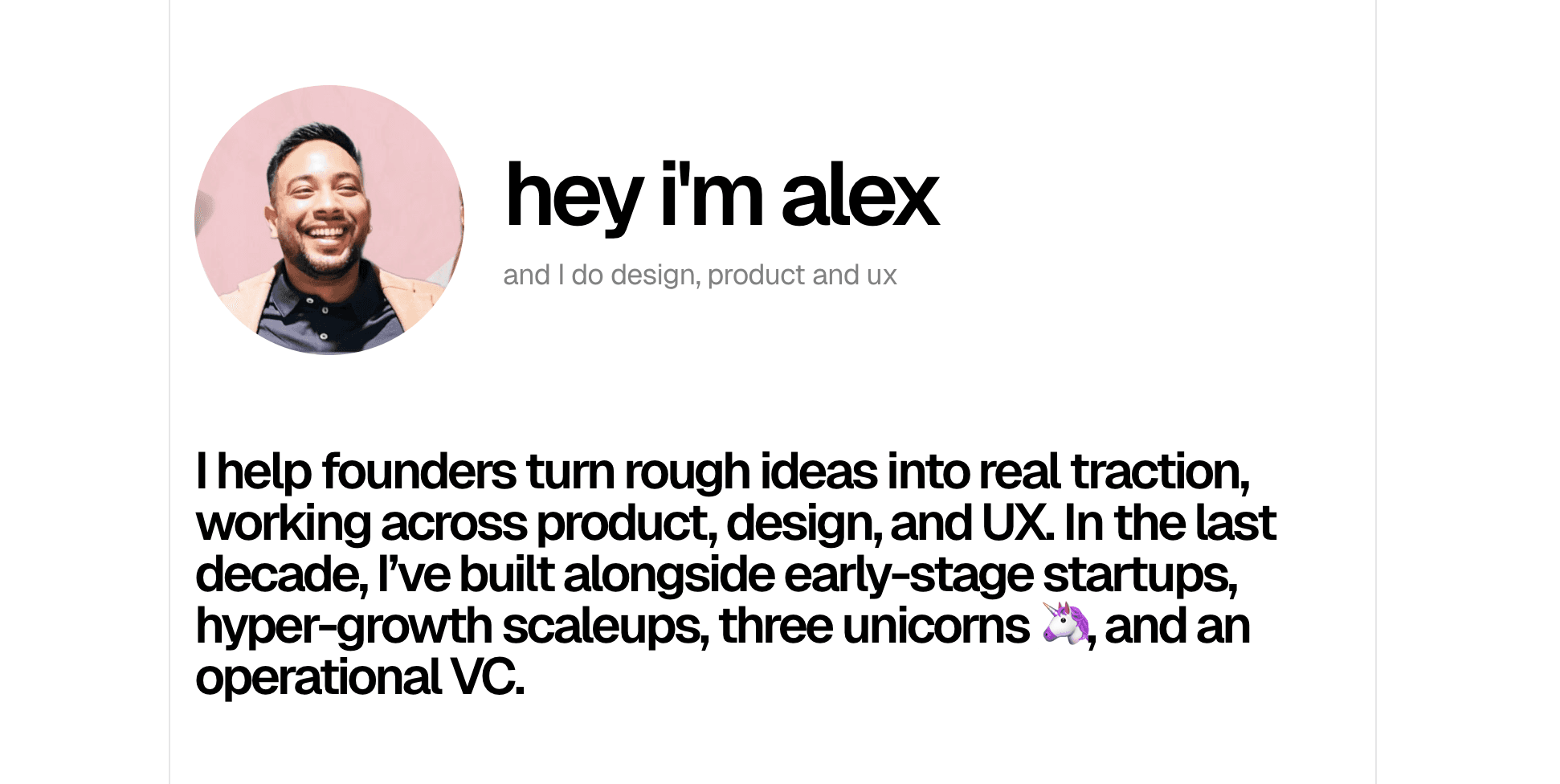 I help founders turn rough ideas into real traction, working across product, design, and UX. In the last decade, I’ve built alongside early-stage startups, hyper-growth scaleups, three unicorns 🦄, and an operational VC.